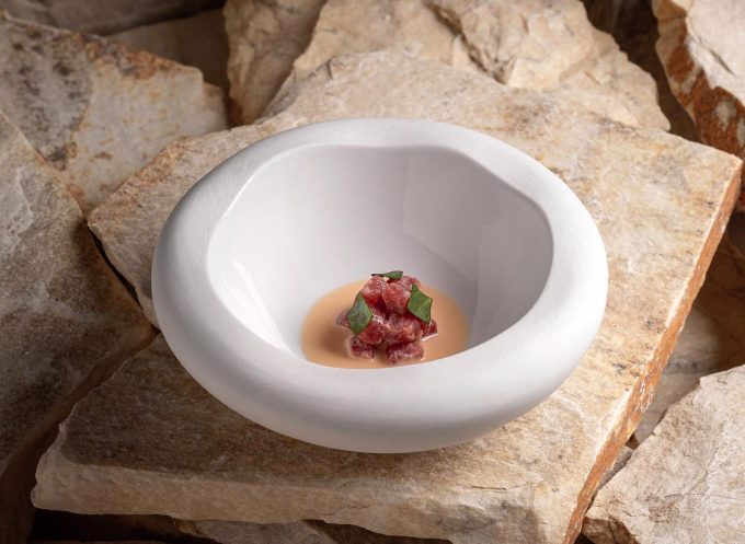 Prueba de ello es la Ensalada líquida de atún que podéis ver ilustrando estas líneas, y a continuación podréis tomar nota de la receta del chef Israel Ramos, veréis que es posible hacerla en todas las cocinas, profesionales y domésticas, y que elaborar este plato, además de ser satisfactorio para el cocinero, cada cucharada del jugo de ensalada con tartar de ventresca de atún rojo, emulsión de alcaparras y hoja de ostra, será un festival para el paladar de todos los comensales.