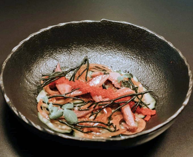 El sunomono se ha convertido en uno de los platos de la gastronomía japonesa más apreciados por quienes descubrimos esta cocina, es una especie de ensalada compuesta por pescados, algas y hortalizas que se curan y/o se maceran en vinagre, y se acompañan de caldo dashi. Cada vez es más fácil encontrar este plato en restaurantes que hacen cocina fusión, como ejemplo podemos mencionar el Restaurante Kraken Art Food de Gijón, y es que su chef, Lara Roguez, es la creadora del sunomono de sardina ahumada que podéis ver en las fotos.