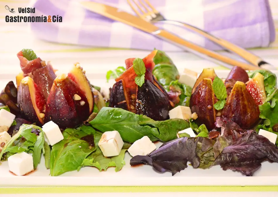 Los higos frescos crudos o brevemente cocinados son ideales para las ensaladas, a menudo se combinan con queso, con jamón e incluso con otras frutas, y con una vinagreta un tanto especial se dispone de un entrante con el que sorprender y disfrutar. Hoy tenemos uno para proponeros, es una Ensalada tibia de higos, jamón y queso feta.