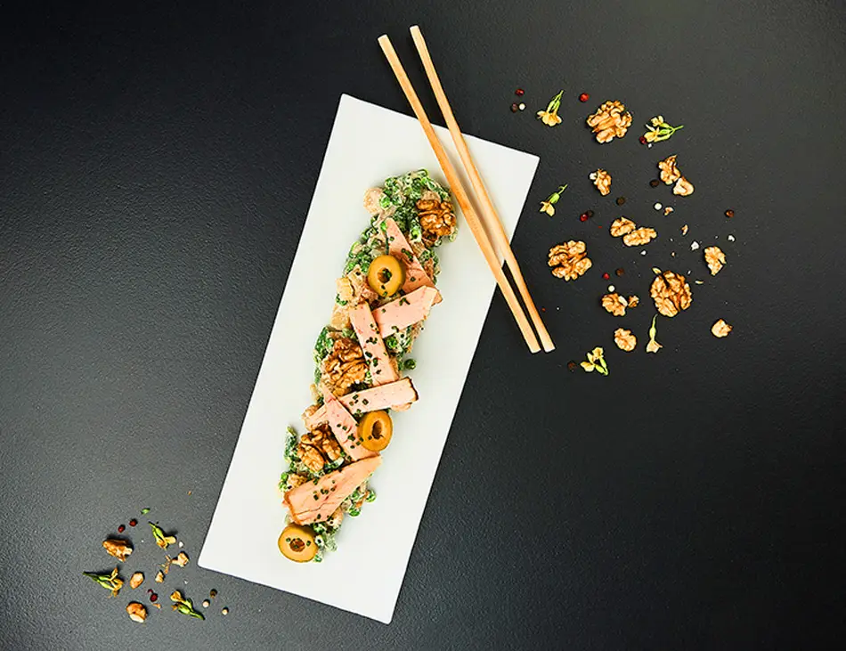 Aliñar las verduras con la mayonesa de nueces y servir en un plato, terminar la receta con unas lascas de ventresca de atún por encima y un poco de cebollino picado para aportar color y frescor
