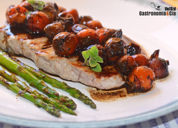 Sirve los entrecots de ternera lechal en los platos, y sobre ellos sirve los tomates con salsa teriyaki. Acompaña también con los espárragos si decides hacerlos. Termina con unas escamas de sal Maldon y unas gotas, pero sólo unas gotas, de aceite de oliva virgen extra. ¡Buen provecho!