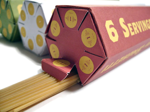 Parece que este packaging para espaguetis no ha prosperado como para salir al mercado, al menos no conocemos marca que lo comercialice, pero ¿no os parece práctico para tener los espaguetis por raciones?. Se trata de un embalaje de forma hexagonal que cuenta con seis compartimentos, así que contiene seis raciones de pasta. Para quien se inicia en la cocina o necesita todas las comodidades, evitar la mise en place… puede resultar práctico.