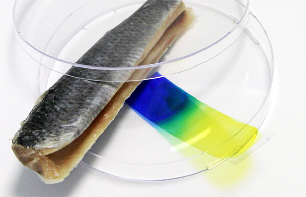 Como podemos comprobar, el sistema es muy similar al desarrollado para los envases exclusivamente cárnicos, cambia el color rojo por el azul y además se incluye un nuevo grupo de alimentos, el pescado. El color amarillo (óptimo) varía según el grado de aminas emitidas, la fotografía muestra claramente las variaciones de color del nuevo film introducido en un envase y puede alertar a aquellos consumidores que son especialmente intolerantes o que son susceptibles a la aminas, mejorando por tanto la seguridad alimentaria.