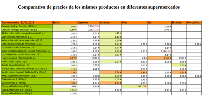 Vosotros mismos podéis consultar los precios que ha tomado FACUA-Consumidores en Acción, durante tres días del pasado mes de marzo. Como comentábamos, han hecho un seguimiento a 104 productos del total de 1.000, son pocos, pero nos parece suficiente para comprobar que los consumidores no mejorarán sus ‘ahorros’ si realizan su compra básica en Eroski. Podéis descargar aquí (Pdf) la tabla con el análisis de precios y saber qué productos han subido, cuáles se mantienen y cuáles han bajado de precio.