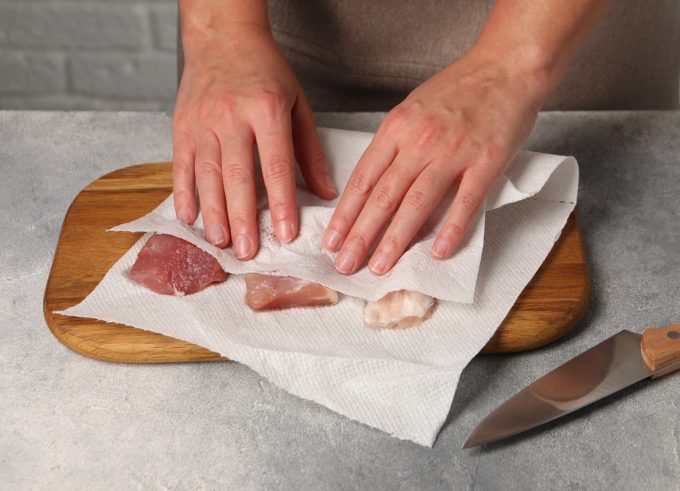 El uso de papel de cocina absorbente para secar la carne descongelada (incluso si es fresca), mejorará la cocción y reducirá riesgos de quemaduras.