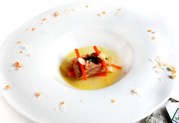 El chef del Restaurante Coque de Humanes de Madrid (1 estrellas Michelin) puso color a la flor de sal de Essex (Inglaterra) con ingredientes naturales y técnicas muy simples, para después hacer algunas recetas con ellas, por ejemplo, este Escabeche de lubina con sal de zanahoria. De esta receta podéis coger varias ideas, y por supuesto, también podéis seguir la explicación de Mario Sandoval paso a paso para ofrecer este plato a vuestros comensales, es una buena opción para un menú especial.