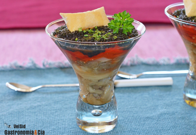 Las copas de escalivada y esferas de esturión están listas para servir, añade, si es necesario, un hilo de aceite de oliva virgen extra. ¡Buen provecho!