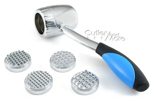 Otro estilo de espalmadera es como el que podéis ver en la imagen inferior, utensilio que tiene un mango corto y se coge a modo de mata sellos, quizá facilitando la labor de espalmar la carne con más precisión. En este caso también los hay con superficie lisa o rugosa, combinando ambas características según el diseño.