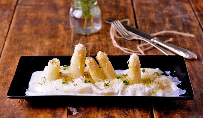 Los espárragos blancos frescos continúan de temporada y los podemos encontrar en las verdulerías de los mercados, pequeños comercios que nos ofrecen productos de proximidad y de estación, y que debemos tener más presentes cuando tenemos que hacer la compra de productos frescos. Así que cuando os acerquéis a vuestro mercado de abastos (o a vuestra tienda de vegetales frescos de confianza), llevaos un manojo para preparar esta receta de Espárragos blancos con piel de leche y queso manchego de María José San Román, es muy fácil de hacer, y tendrás un entrante con el que sorprender a tus comensales, ideal para un menú especial.