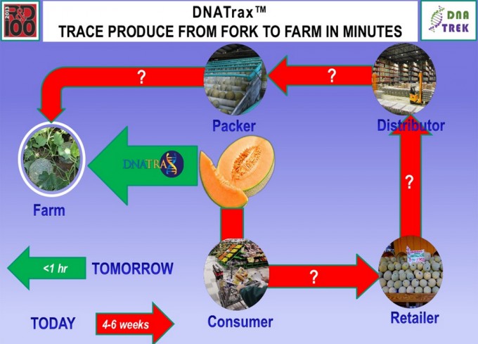 La compañía startup DNATrek propone un sistema con el que se podrá garantizar mucho mejor la trazabilidad alimentaria, pues permite identificar fácilmente toda la información sobre el origen, la producción y procesamiento. El sistema se basa en un espray con tecnología ADN, se trata de una solución líquida sin sabor ni olor, con la que se rocían alimentos como frutas y verduras para que quede en ellos impreso un código de barras genético.