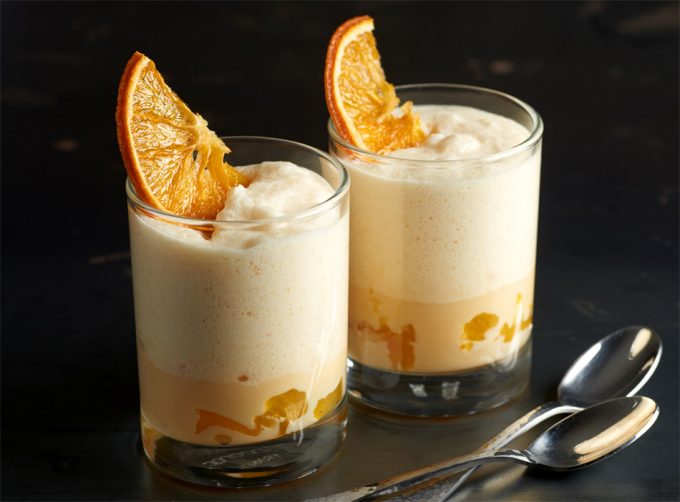 Reparte una capa de gelatina de naranja en el fondo de cuatro copas o vasos de cristal y escudilla encima la espuma de almendras. Decora con media rodaja de naranja crujiente y sirve.