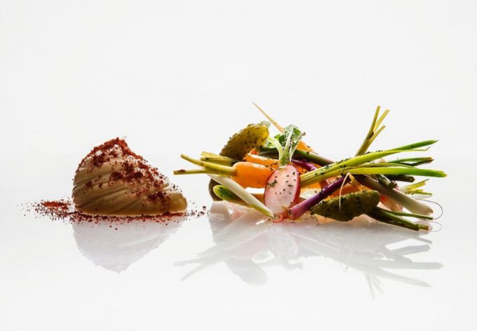 Lo que el chef denomina ‘vinagres’, son las mini hortalizas que prepara en un escabeche ligero, minipuerros, minizanahorias, rabanitos y pepinillos, son los vegetales que propone para dipear o mojar en la espuma de hummus o crema de garbanzos, pero hay muchas otras alternativas, ya que concretamente los minupuerros y las minizanahorias no siempre son fáciles de encontrar si no se dispone de un proveedor especializado. En cualquier caso, será muy fácil hacer unos bastones de zanahoria y de calabacín, por ejemplo.