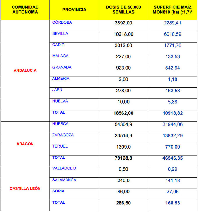 Esto ocurre también en otras Comunidades Autónomas, en Andalucía, según la Consejera de Agricultura se cultivaron 3.147 hectáreas, según el Ministerio 10.918,82 ha, lo que representa un desfase de prácticamente el 70%. Según Greenpeace las diferencias entre las estimaciones y la realidad se suceden en todas las Comunidades Autónomas que proporcionan información sobre la superficie de cultivo que se destina al maíz Mon810. Lo cierto es que no tiene sentido tal desfase y evidentemente, o lo hacen muy mal, o alguien miente. Por otro lado hay que preguntarse ¿por qué existe un interés por publicar las cifras infladas en vez de las cifras que proporcionan las CCAA? recordemos que de este tema ya hablamos en el año 2014.