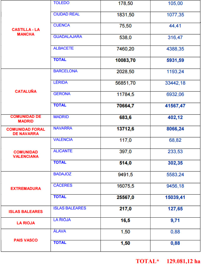 En la tabla podéis ver que, de nuevo, la Comunidad de Aragón se coloca como la que más tierra de cultivo emplea para la producción de transgénicos con 46.546,35 ha, destacando la provincia de Huesca con una superficie de 31.944,06 ha, le sigue Zaragoza con 13.832,29 ha y Teruel con 770,00 ha. Si comparamos estos resultados con los datos del año 2014, podemos comprobar que la reducción es significativa, ya que la estimación se cifró entonces en 54.040’50 hectáreas.