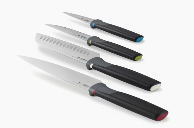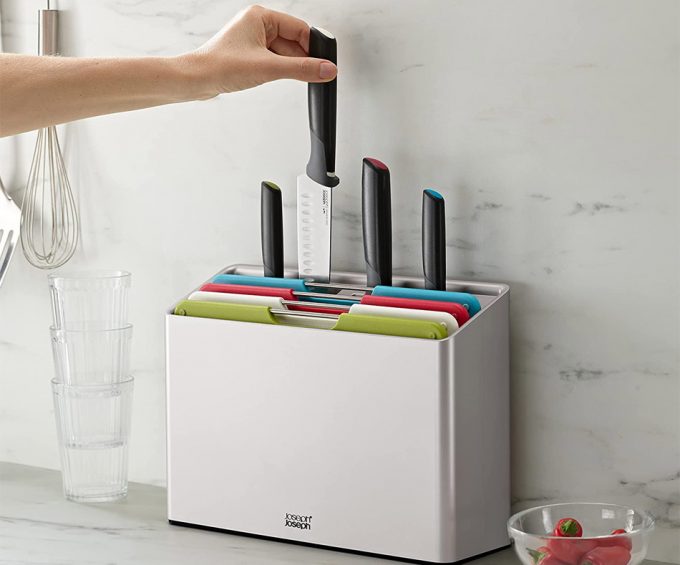 Tener a mano los utensilios de cocina que más utilizamos es una comodidad indiscutible, y aunque también somos de los que nos gusta tener la encimera de la cocina limpia y con lo mínimo posible, nos gusta la idea del juego de tablas con el set de cuchillos que podéis ver ilustrando estas líneas, cuyo diseño pertenece a Joseph Joseph. Precisamente hace pocas semanas os enseñábamos una de las novedades del catálogo de esta marca, el set de tres tablas de corte que se coloca en la repisa inferior o interior de un armario, y así no ocupa nada en la encimera.