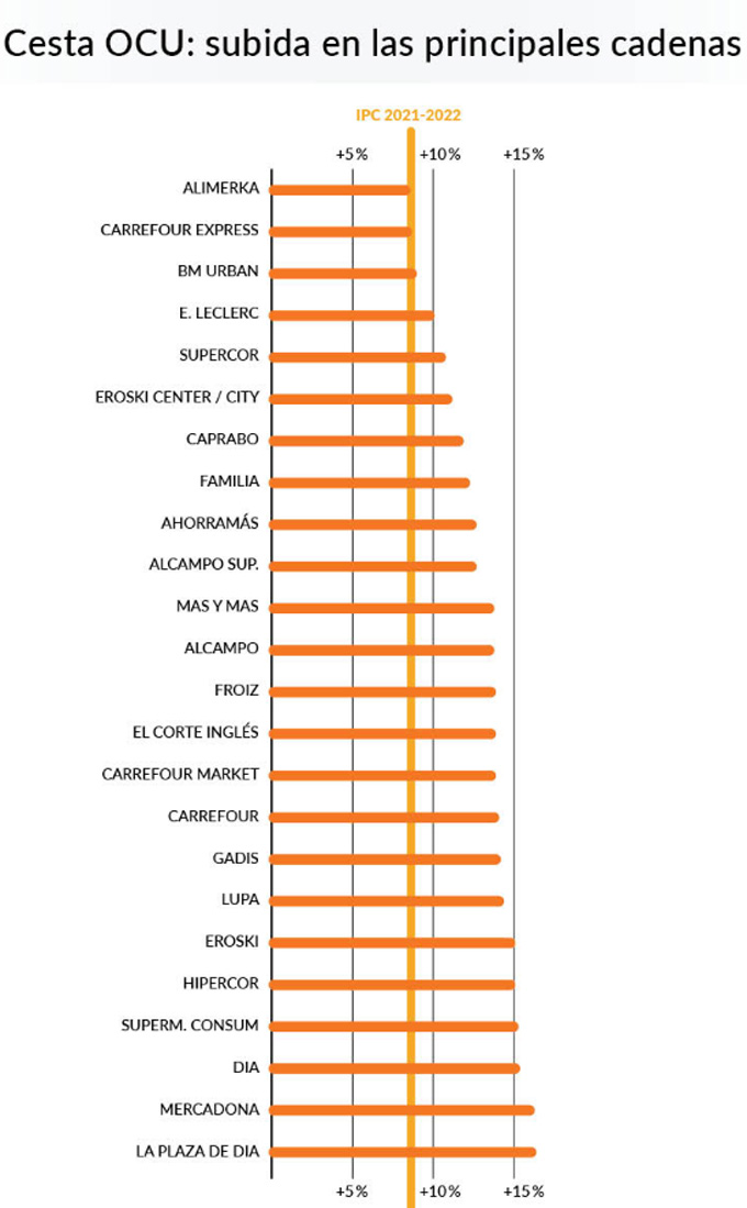 Pues vamos con los datos actuales, aunque la subida de precios ha sido generalizada y dicen, bastante homogénea porque todas las cadenas han incrementado precios entre un 10 y un 15%, hay algunas que han superado estos porcentajes, por lo que los supermercados que lideran la lista del estudio de la OCU son Día y Mercadona. Por un lado está Día & Go, que ha incrementado sus precios un 17’1%, le sigue La Plaza de Día, que ha incrementado sus precios el 16’2%, y Día a Día ha subido sus precios un 15’2%. Mientras que el aumento de precios de Mercadona está en un 16’1%.