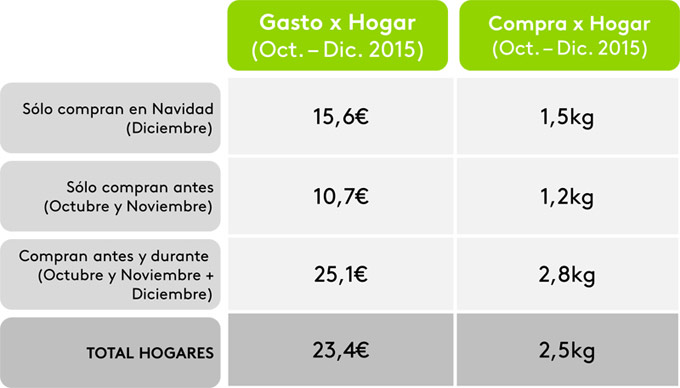 Este segmento de familias que compran para guardar adquiere una media de 1’2 kilos de estos dulces navideños gastando unos 10’7 euros. Quizá hubiera sido interesante conocer concretamente el tipo de dulce y la cantidad adquirida, ya que si se trata de turrones de calidad media, el coste por kilo refleja, o bien que se adquieren los turrones más económicos, o que se consumen muy poco. El 66% restante de quien compra fuera el mes de diciembre, vuelve a comprar alguno de estos productos durante las fechas navideñas, por lo que al final la media de la cantidad comprada es de casi 3 kilos y el gasto medio asciende a 25’1 euros. Este dato muestra previsiblemente que se compran los dulces antes de fecha para consumirlos.