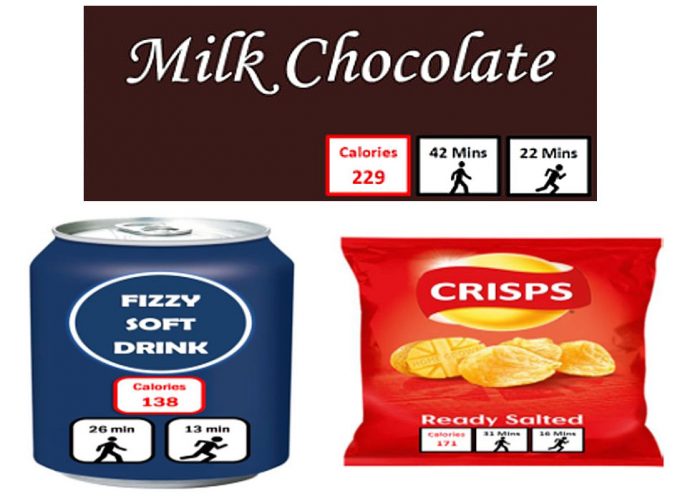 De este tema se ha vuelto a hablar ahora a través de una investigación realizada por expertos de la Universidad de Loughborough (Reino Unido), cuyos resultados aseguran que las etiquetas alimentarias con información sobre la actividad física equivalente para consumir su energía, ayudaría a tomar decisiones dietéticas más saludables, contribuyendo a frenar el sobrepeso y la obesidad. Los investigadores proporcionan un ejemplo, para contrarrestar unas 230 calorías que aporta, por ejemplo, una barrita de chocolate, sería necesario correr durante 23 minutos o caminar durante 46 minutos. Esta información se expresaría mediante un pictograma deportivo, acompañado del tiempo de actividad física a realizar.