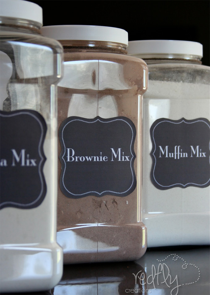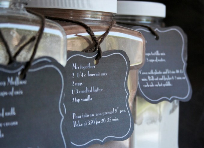 En el frontal del tarro se puede poner una etiqueta sencilla, pero en la misma línea, en la que indique qué mezcla de receta contiene. Algunos ejemplos que podéis ver son mezcla o mix para brownie, para muffins, para tortitas… si estas etiquetas os interesan, aunque son en inglés, podéis descargarlas de forma gratuita en Pdf, aquí la etiqueta frontal y aquí la receta. Si tenéis dudas sobre ellas, en Redfly Creations encontraréis más detalles e incluso más recetas para mixes.