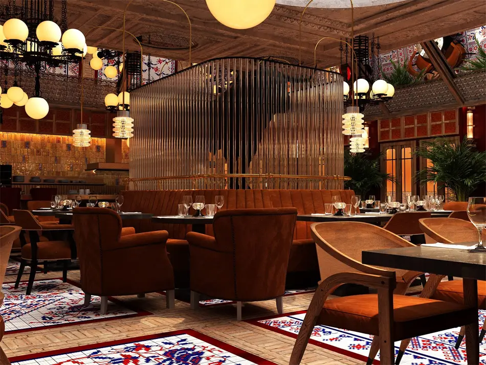 El interiorismo del hotel en manos de Lázaro Rosa-Violán ha creado un ambiente que trasladará a los clientes a los años 50, y concretamente el restaurante Etxeko Madrid de Martín Berasategui, está inspirado en un mesón madrileño, con visillos brocados, baldosas de cerámica con gráficos de punto de cruz, colores cálidos como el amarillo albero y el rojo carmesí, madera, sillas, bancadas, barra de bar…