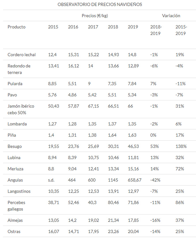 El caso es que la OCU ha facilitado unos primeros datos sobre los precios de los productos típicos de Navidad, éstos formarán parte de su Observatorio de Precios una vez que hayan podido comprobar cómo evolucionan en estas semanas y realicen el informe. Los datos corresponden 15 productos alimenticios, son los siguientes: Cordero lechal para asar por cuartos, redondo de ternera, pularda, pavo, jamón ibérico de cebo al corte, col lombarda, piña, besugo, lubina de acuicultura, merluza al corte, angulas, langostinos cocidos no congelados (calibre 40/60), percebes gallegos, almejas babosas y ostras (docena).