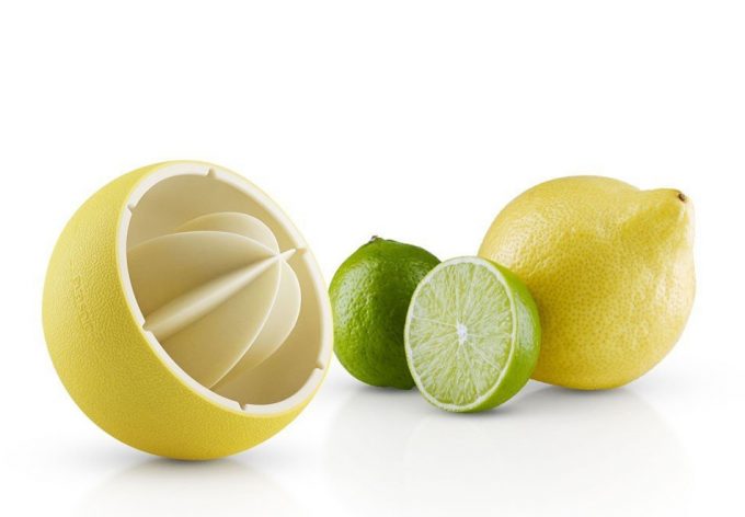 En las fotos podéis ver el denominado Citrus Press de Eva Solo, la empresa danesa ha diseñado un exprimidor que imita al cítrico real en su forma, representa que es medio limón y su superficie es amarilla y rugosa, como su piel. Con ello ya incluyen una de las características prácticas del utensilio, que sea fácil de agarrar y sostener con la mano, sin que se resbale.