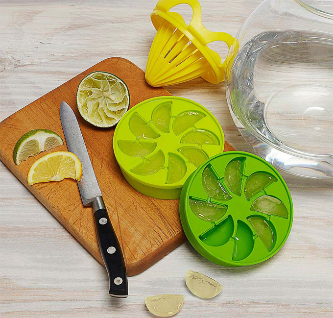 Sobre su uso, si os habéis fijado en las imágenes, los moldes tienen unas muescas por las que puede pasar el zumo de limón, de lima o de otros cítricos para rellenar todas las cavidades, y se rellenan exprimiendo la fruta directamente sobre los moldes. ¿Qué os parece la idea? Si queréis conocer más detalles o información sobre el fabricante, podéis acceder a la web de la empresa a través de este enlace.