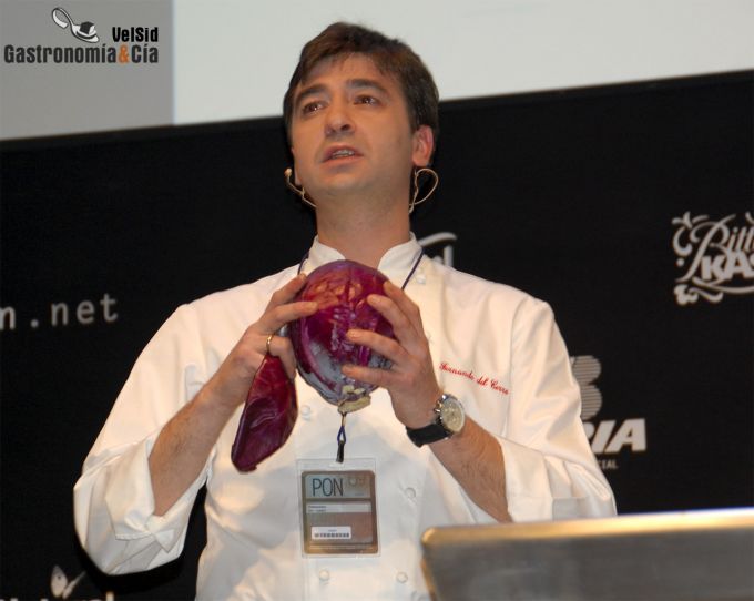 Los tres platos que ha elaborado en el Congreso, en el que ya sabemos que tienen el tiempo contado, han sido con distintas variedades de coles y todas ellas en crudo, con lo que afirma que se ‘airea’ la calidad del producto. Dada su experiencia con las crucíferas, tomamos nota de alguna de sus recomendaciones, como que debemos escoger las piezas más pequeñas y prietas porque resultan más dulces y crujientes (cualidades muy importantes), y además tienen menos venas. Y que una vez que las compramos, las guardemos en el frigorífico en sucio (a pesar de las recomendaciones de Sanidad), ya que siendo recién recolectadas y tal cual nos la entregan, si las introducimos rápidamente en frío, se conserva lo más parecido a su hábitat.
