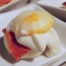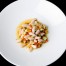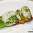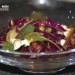 Seguidamente nos presenta una Ensalada de col lombarda que acompaña de una crema de piñones (elaborada al 50% con agua y sin triturar en exceso para poder masticar el fruto), champiñones también en crudo, granada y hierbas. Para este plato elige una vinagreta en la que sustituye el aceite por grasa de foie de pato, el vinagre utilizado es de Jerez y la rebaja con un poco de agua.