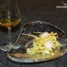 Para empezar nos ha enseñado una Ensalada de invierno que sugiere que es tradicional de La Mancha. Se elabora con repollo, tomate pera que han embotado en verano, zamburiñas y una vinagreta hecha con caldo. Este plato se sirve como aperitivo acompañado de una copa de aceite de acebuche, un aceite elaborado con aceitunas de olivos silvestres que no destaca por sus cualidades organolépticas, sino por su fluidez en el paladar. Así pues, esta copa de aceite se convierte en el maridaje ideal para esta ensalada de invierno.