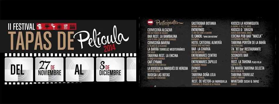 El año pasado tuvimos la suerte de que una lectora compartiera las tapas que había probado, esperamos que en esta segunda edición también nos contéis cómo han relacionado un pequeño bocado con una película en el II Festival de Tapas de Película de Almería.