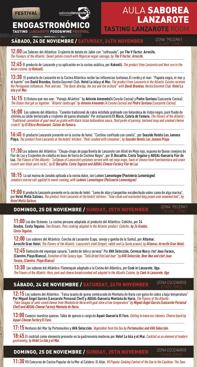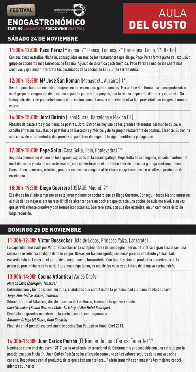 Sobre estas líneas podéis ver el programa del Aula del Gusto, donde se llevarán a cabo charlas y ponencias de cocineros de reconocido prestigio internacional. Mientras en el Aula Saborea Lanzarote participarán algunos chefs miembros del colectivo Lanzarote Cocina impartiendo talleres de cocina más enfocados al producto local.