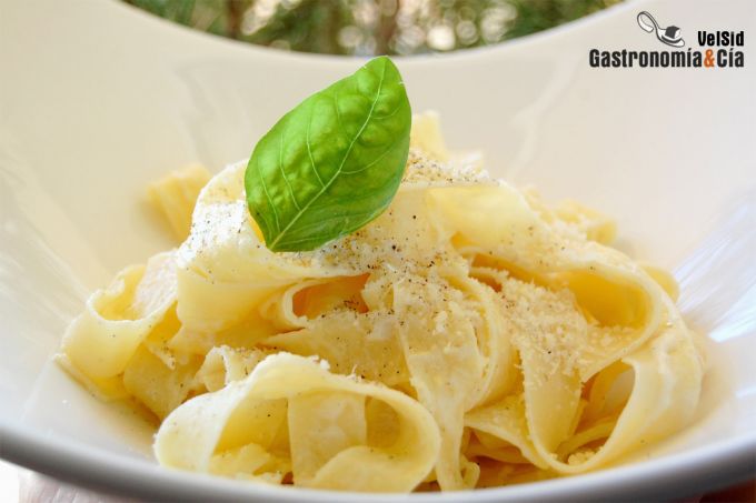 Hoy hemos hecho la receta de Fetuccini Alfredo con crème fraîche, pero también se pueden hacer con nata, en este caso hay que cocer la salsa unos minutos para que resulte más densa. El hecho de añadir un poco de ajo sofrito a la mantequilla es una técnica utilizada en otra sencilla elaboración de pasta italiana, la Pasta al burro (mantequilla), pero que adoptamos para este plato. Poco más lleva esta pasta, aunque podréis encontrar recetas en las que incorporan jamón, yema de huevo como en la Carbonara…