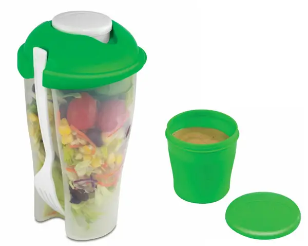 Todo lo necesario para comer una ensalada en cualquier momento y en cualquier lugar, ocupando el mínimo espacio posible, pues bien es cierto que cualquier fiambrera o tupper nos sirve para conservar una ensalada que debamos transportar, pero no siempre se dispone del tamaño de recipiente apropiado, pueden ocupar mucho espacio en el bolso o mochila, es necesario portar dos recipientes para mantener separado el aliño, por otro lado los cubiertos…