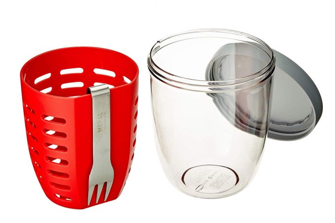 El Fruit & Veggie Pot de Mepal, que sigue la línea de este táper para desyunos y meriendas, está fabricado en polipropileno libre de bisfenol A, mientras que el tenedor es de acero inoxidable. En cuanto a sus dimensiones, tiene un diámetro de 10’7 centímetros, una altura de 12’7 centímetros, una capacidad de 600 ml y pesa poco más de 200 gramos.