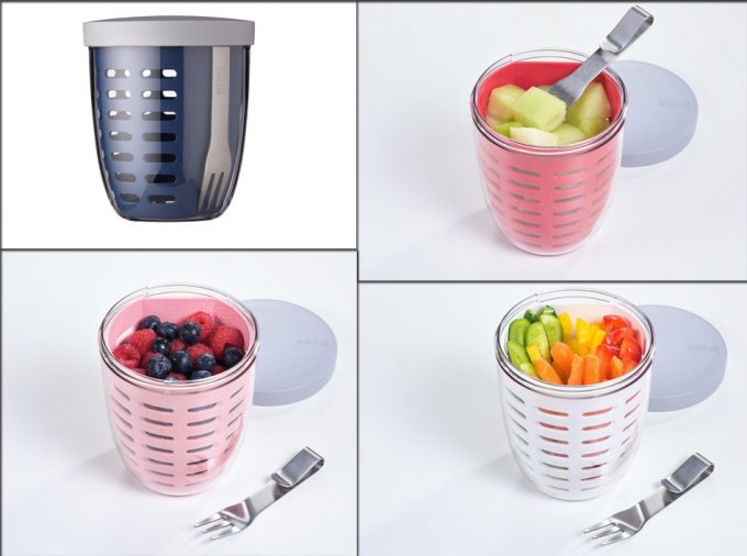Se llama Fruit & Veggie Pot, y es un recipiente que se compone de cuatro piezas, el tarro o bote alto, en forma de vaso que es cómodo de coger con una mano, la tapa, un escurridor y un tenedor, y como podéis apreciar, tiene un diseño elegante a la vez que sencillo y moderno. La idea de este porta alimentos es que se pueda disfrutar de frutas y hortalizas frescas sin que queden encharcadas después de lavarlas.