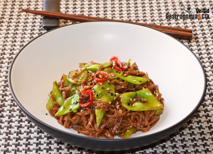 Sirve los fideos soba recién salteados con los tirabeques con salsa de soja, guindilla y sésamo. ¡Buen provecho!