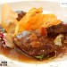 ¿Qué os parece empezar con una Espuma de huevos fritos y patatas fritas con manzanilla de Sanlucar?, es un rico aperitivo, creativo y respetuoso en sabor. Éste precede a unas Alcachofas gratinadas con Boletus Edulis y perdiz escabechada, una exquisitez como os podéis imaginar, equilibrio de sabores y texturas en un plato cuyo ingrediente principal, la alcachofa pero la Alcachofa de Benicarló, ya sabemos que es muy exigente.