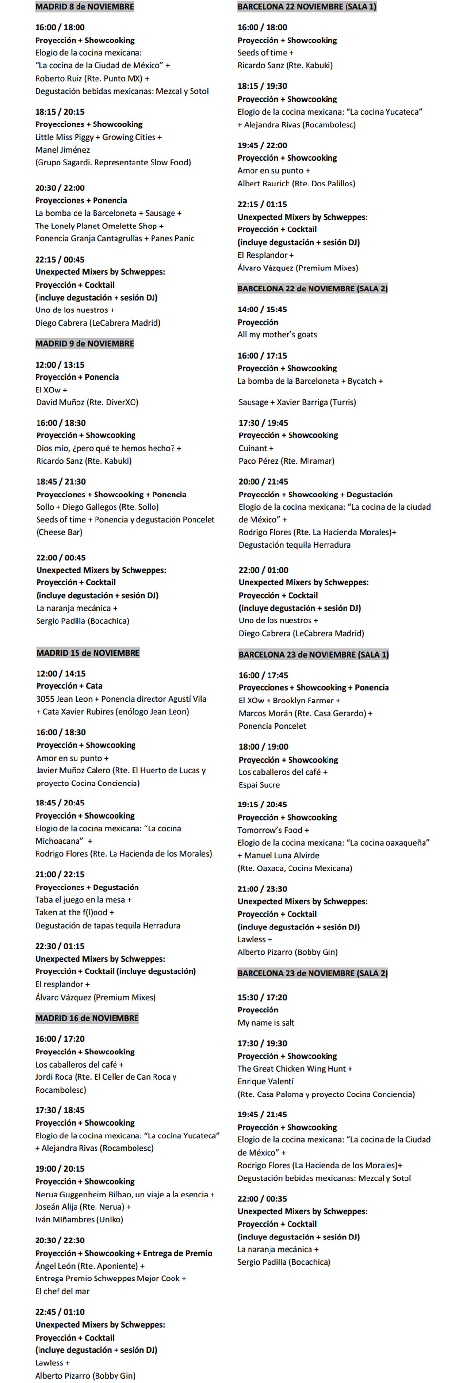 Bajo estas líneas tenéis el programa completo del Festival de Cine y Gastronomía que se va a celebrar en Madrid y Barcelona, para los que ya se han puesto a la venta las entradas. Se han creado abonos de día que tendrán un precio de 25 euros y darán acceso a todas las sesiones de la jornada. En el caso de querer adquirir entradas para actos individuales, éstas tendrán un precio de entre 5 euros si se trata de proyección + ponencia, proyección + degustación, proyección individual y proyección + coctelería, y de 8 euros si incluyen showcooking.