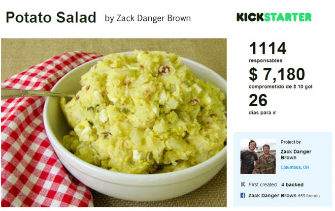 Hoy nos llama la atención la solicitud realizada en Kickstarter por el usuario estadounidense Zack Danger Brown, en la que se pide financiar una simple ensalada de patata. En principio solicitaba sólo 10 dólares (unos 7 euros), y ya ha recaudado más de 7.000 dólares (más de 5.000 euros) aportados por 1.100 personas, y faltan 26 días para que finalice la campaña.