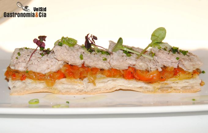 El jefe de cocina de Fishop elabora dos platos, una Coca de recapte con ventresca de atún confitada, es una versión actualizada de una receta tradicional catalana. Como base dispone de un fino pan tostado, lo cubre con pimiento, berenjena y cebolla escalibados. La parte de la ventresca del atún que es más fibrosa y con más nervio, lo que dificulta su consumo en crudo, es la que utilizan para este plato, confitándola durante tres cuartos de hora en aceite a baja temperatura. Una vez hecha y reposada, se corta en porciones para cubrir la ‘coca de recapte’.