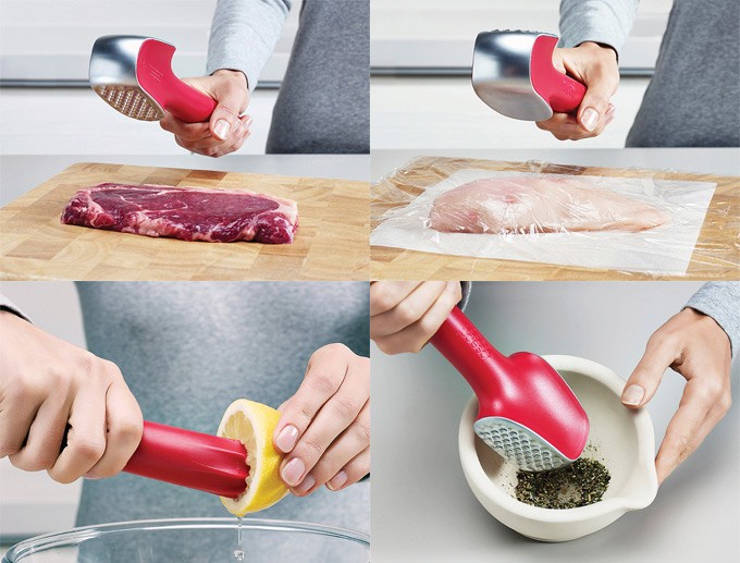 Quizá podríamos decir que es un 3 en 1, porque una de sus funciones es de espalmadera o mazo de cocina, y muchas de ellas ya cuentan con los dos tipos de superficie habituales, uno liso y otro con pinchos u otro tipo de grabado. En cualquier caso, el Flavouriser de Joseph Joseph es un utensilio multifunción, y ha sido concebido como una herramienta para ablandar y aportar sabor principalmente a carnes.