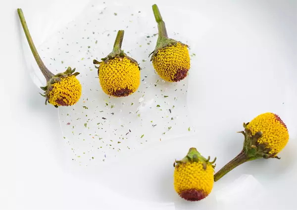 Hay formas más sutiles de incluir esta sensación de hormigueo con las flores eléctricas en los platos, e incluso en las bebidas, recordamos que Javier de las Muelas también nos la ofreció en infusión cuando visitamos el Speakeasy. Otra forma habitual de incorporarla es triturando las flores y espolvoreándolas sobre los platos, por lo que su efecto no está tan concentrado.