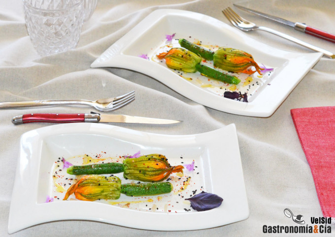 Nos encantaría que probarais esta receta de flores de calabacín al vapor, con su relleno de requesón, queso y almendras, ya veis que para acompañar no necesitan mucho más, un buen aove (aceite de oliva virgen extra), unas flores de ajo, unas semillitas de ajonjolí negro… aunque no son imprescindibles, y también se pueden sustituir por semillas blancas, que son más comunes. Esperamos vuestros comentarios.