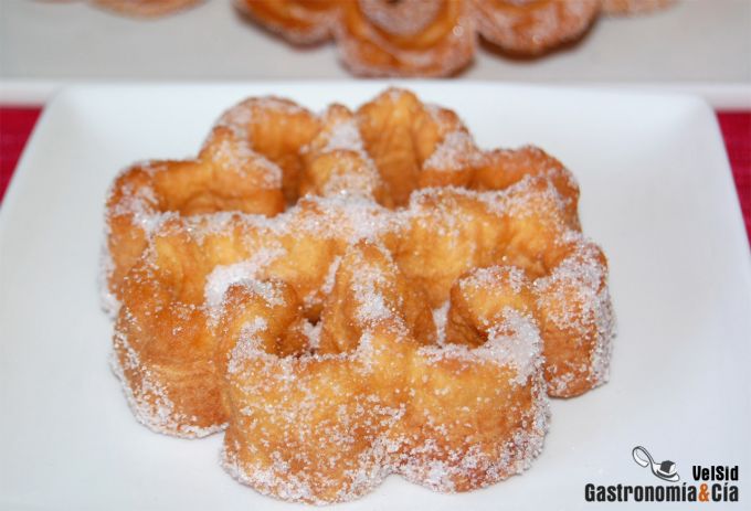 Dale la vuelta a la flor para que se dore bien por los dos lados y cuando la retires, pósala sobre papel de cocina absorbente, a continuación espolvorea sobre ella azúcar o azúcar mezclado con canela. Para hacer la siguiente flor vuelve a calentar el molde en el aceite antes de introducirlo en la masa, y así sucesivamente. Ya sabes que a la cuarta flor, ya tendrás dominado el proceso.