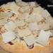 Pon la masa de la focaccia en la bandeja del horno cubierta con una tela de cocción y ligeramente enharinada, cúbrela con un paño mientras preparas los ingredientes para cubrirla y precalientas el horno a 220º C, teniendo un nuevo reposo aproximado de 30 minutos, si no es así, déjala reposar hasta que veas que ha subido un poco. Pela la cebolla y córtala en finas rodajas, corta el queso en lascas, nosotros nos ayudamos de un pelador de verduras.