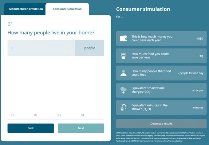 Con un cálculo de tres personas viviendo en el hogar situado en Europa, un gasto en alimentación semanal de 100 euros y el deseo de reducir un 25% el desperdicio alimentario, el simulador da como respuestas que podríamos ahorrar 429 euros al año, 63 kilos de comida con la que se podrían alimentar a 35 personas en un día, se reduciría el gasto en agua en 232 minutos de ducha, y se reduciría unos 76 euros anuales los cargos de teléfonos inteligentes, como medida de equivalencia en la liberación de dióxido de carbono.