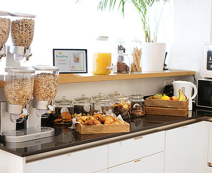 Para configurar una mejor oferta, con la nevera conectada también se instala un autoservicio con otros productos específicos para el desayuno o la merienda, zumo de frutas y otras bebidas naturales, cereales, productos de bollería tradicionales como galletas, muffins, brownies o magdalenas, aperitivos como chips de verduras, frutos secos, café, té, etc. Este sistema también funciona mediante el sistema conectado, con el que se puede conocer la oferta disponible, lo que se necesita reponer y si es necesario cambiar determinados productos de la oferta.