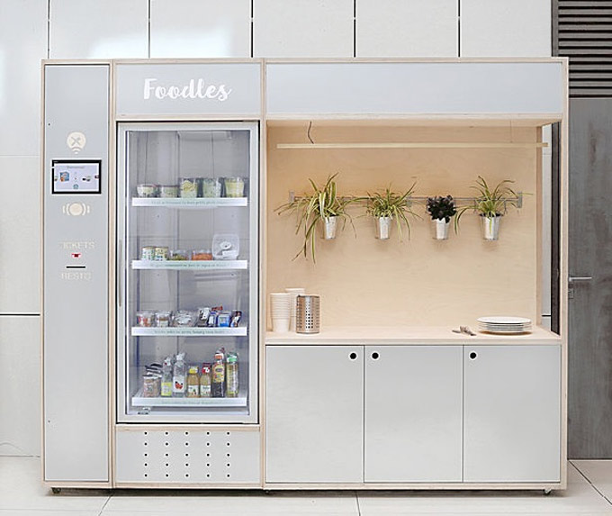 Foodles es una nevera conectada concebida para ser instalada en las oficinas de empresas, ofreciendo una alternativa a las tradicionales máquinas expendedoras de productos procesados y a la restauración tradicional corporativa. La idea de esta empresa francesa es proporcionar comidas completas con ofertas y opciones vegetarianas que incluso se pueden pedir con antelación, para que cuando llegue la hora de comer, el cliente tenga acceso a esa comida que se habrá introducido en este cruce entre nevera y vending.