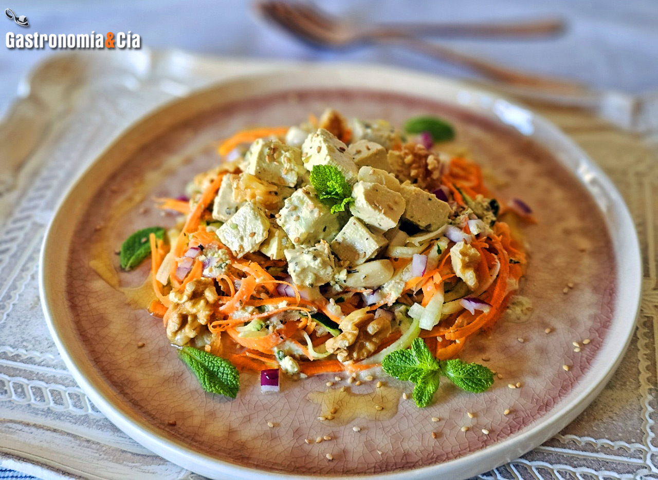 Tofu con harissa verde y tallarines